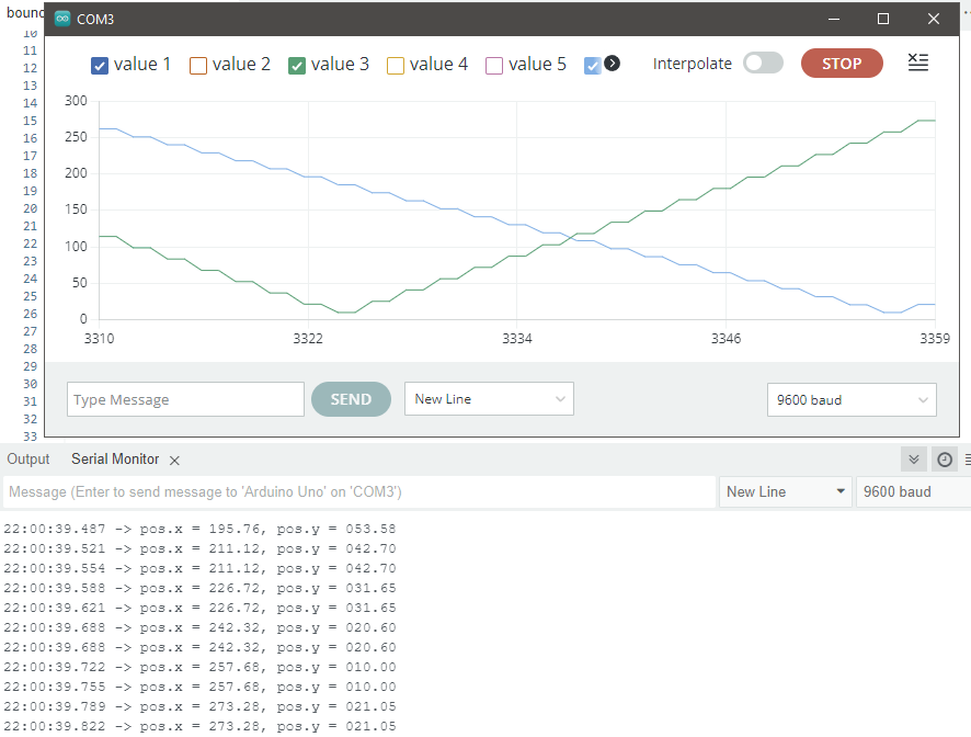 Una volta caricato lo sketch, prima ancora di passare al progetto Weintek EasyBuilder è possibile verificare i valori di x e y della pallina tramite il serial monitor e il serial plotter di Arduino IDE.
